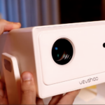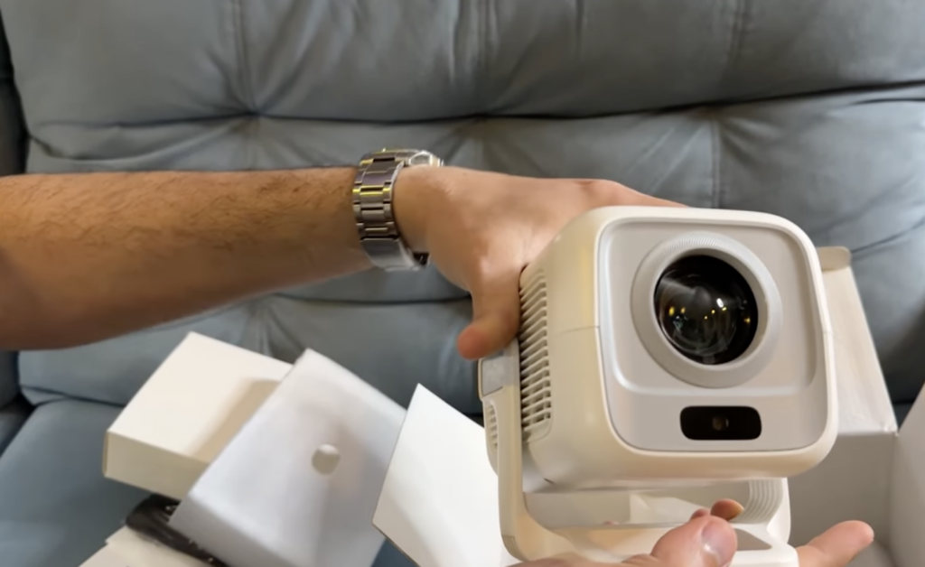 O ponto que mais chama atenção na construção é esse “sistema de inclinação” (estilo gimbal/suporte articulado), que permite ajustar o ângulo para projetar frontal e também pensar em uso mais próximo/na frente do usuário, que é justamente onde ele parece render melhor.